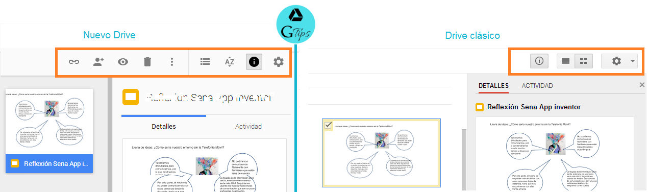 Ahora cuando seleccionas un archivo te aparecen inmediatamente opciones como: mostrar vínculo, compartir, vista previa, enviar a la papelera y más opciones. Esto hace que sea más rápido y eficaz el trabajo con los archivos.