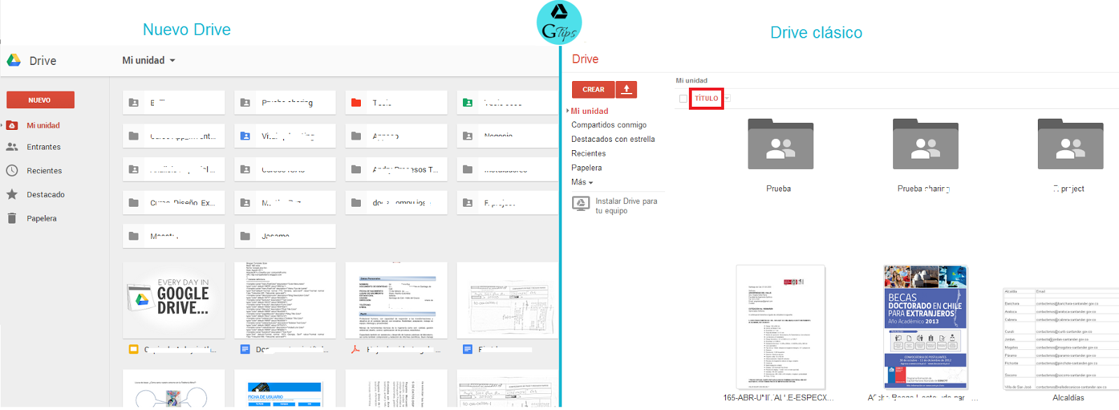 Además se ha dividido la visualización entre archivos y carpetas. Las carpetas quedan organizadas en la primera posición y debido a la reducción del tamaño de sus iconos, ocupan menos espacio. Personalmente pienso que esto genera una mejor visualización de los archivos, lo que hace que sea más organizado y fluido. Para hacer esto, en la versión antigua versión de GDrive, tenías que organizar los archivos por «Nombre», sólo de esta manera conseguías que las carpetas se organizaran en primera posición.