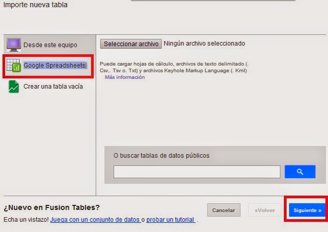 2. Abrir Google Fusion Tables y hacemos clic en Google Spreadsheets: