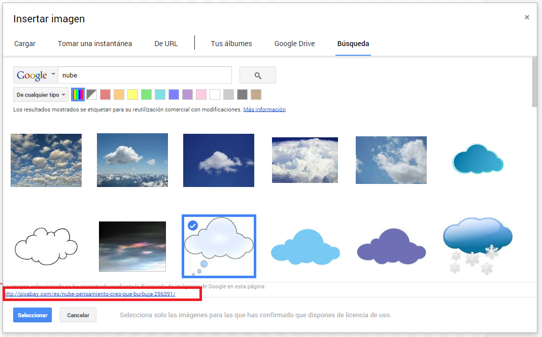 Las imágenes: Puedes importar imágenes desde tu computadora, pero también puedes buscarlas dentro de Google. Para ello haces clic en el menú Insertar > Imagen >Búsqueda. Lo bueno es que estas imágenes están previamente filtradas y por lo general son de uso gratuito, sin embargo te recomiendo revisar su licenciamiento haciendo clic sobre el enlace que aparece cuando seleccionas la imagen.