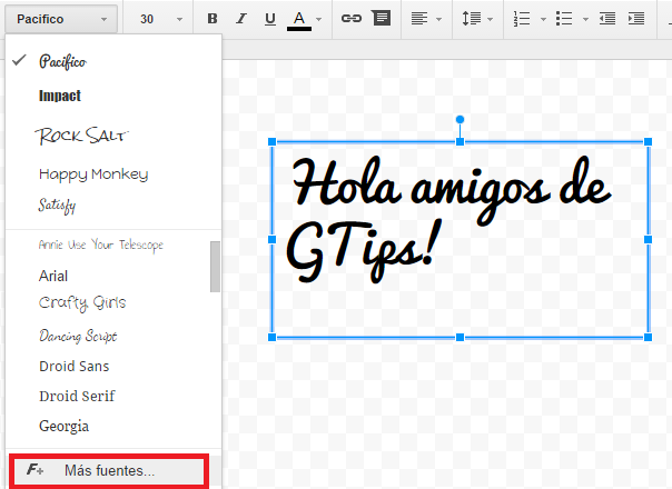 Tipos de fuente: Hay una cantidad muy buena de tipos de fuentes que puedes emplear. Inserta un cuadro de texto  y a continuación escoge el tipo de letra que más te guste, si las que aparecen por defecto no son de tu agrado puedes importar más.